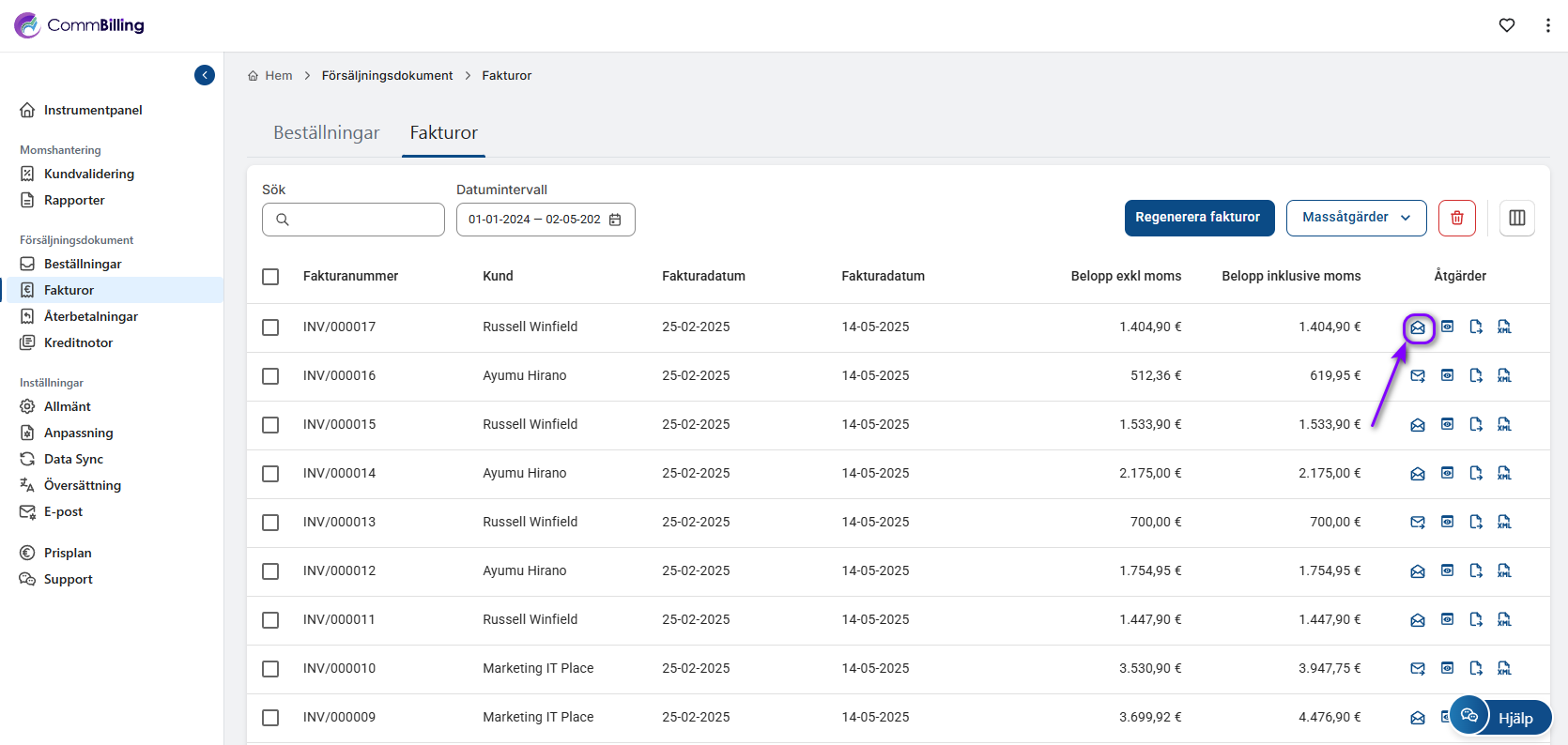 4. Klicka på knappen Skicka e-post bredvid fakturan för att skicka den direkt till kunden med den e-postadress som är kopplad till deras order.