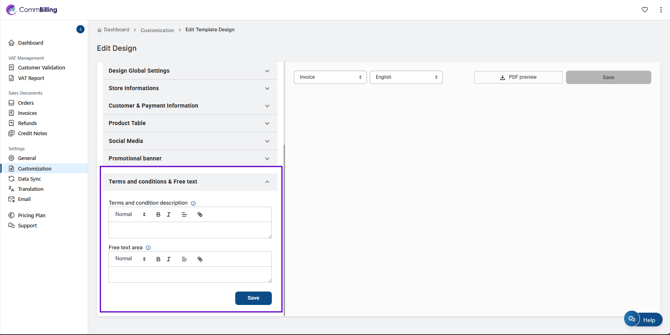 - Adım 5: Banka bilgileri, ödeme süreleri, kabul edilen ödeme yöntemleri veya ek koşullar gibi özelleştirilmiş talimatlarınızı girin. Güncellenen içeriği doğrulamak için değişiklikleri fatura şablonu içinde gerçek zamanlı olarak önizleyin ve ardından Kaydet’e basın.