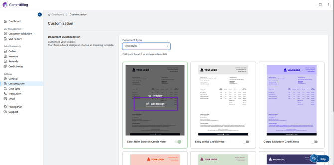 Kredi notu şablonlarınızı özelleştirmek, belgelerinizin marka kimliğinizle görsel olarak uyumlu olmasını sağlarken müşterileriniz için de netlik sunar. CommBilling’de kredi notlarınızın düzenini, renklerini ve içerik öğelerini tercih ettiğiniz tasarım ve iletişim stiline uygun şekilde kolayca ayarlayabilirsiniz.