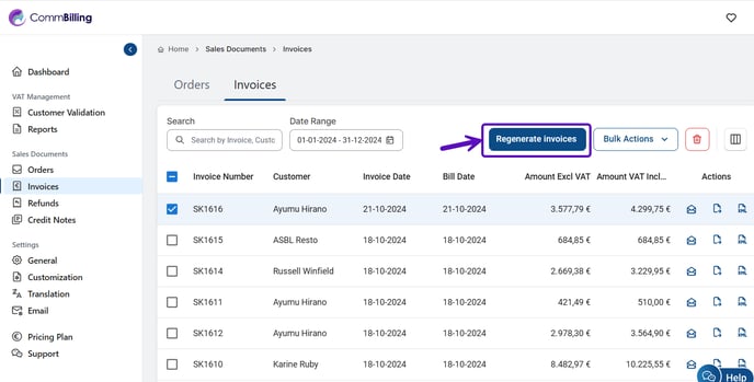 2. Listeden yeniden oluşturmak istediğiniz faturayı (veya faturaları) seçin.